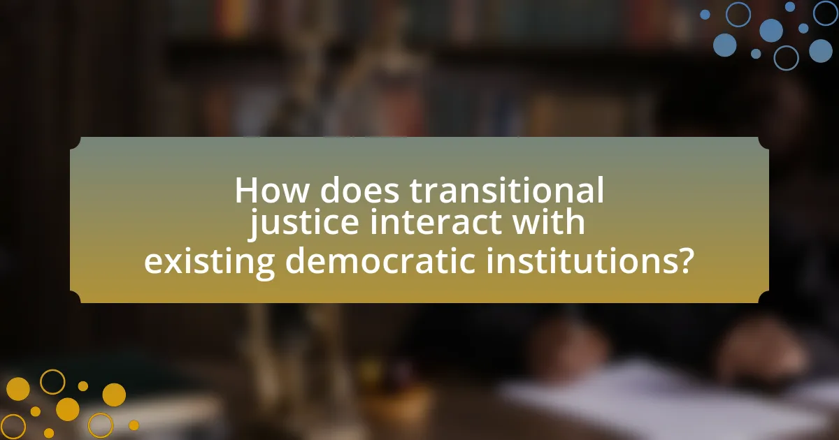 Transitional justice interacts with existing democratic institutions by reinforcing accountability, promoting rule of law, and fostering public trust in governance. This interaction is evident in post-conflict societies where transitional justice mechanisms, such as truth commissions and reparations, are integrated into democratic frameworks to address past human rights violations. For instance, in South Africa, the Truth and Reconciliation Commission was established within the democratic system to facilitate healing and accountability, thereby strengthening democratic norms. Additionally, transitional justice processes often require the involvement of judicial institutions, which can enhance their legitimacy and effectiveness, as seen in countries like Sierra Leone, where special courts were set up to prosecute war crimes while operating alongside existing legal systems.