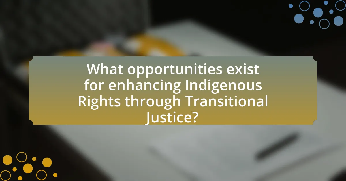 Transitional justice provides opportunities for enhancing Indigenous rights by promoting accountability, reparations, and recognition of historical injustices. These mechanisms can facilitate the acknowledgment of past wrongs against Indigenous communities, such as land dispossession and cultural erasure, thereby fostering healing and reconciliation. For instance, the Truth and Reconciliation Commission in Canada has highlighted the need for reparative measures and has led to policy changes aimed at recognizing Indigenous sovereignty and rights. Additionally, transitional justice frameworks can empower Indigenous voices in decision-making processes, ensuring their participation in shaping policies that affect their communities. This participatory approach is essential for addressing systemic inequalities and promoting social justice for Indigenous peoples.